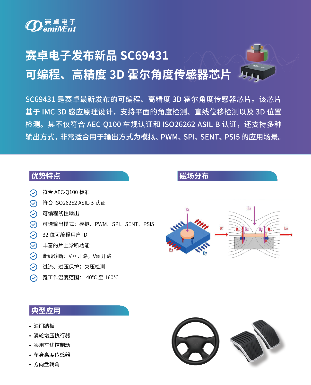 SC69431是赛卓最新发布的可编程、高精度 3D 霍尔角度传感器芯片。该芯片基于 IMC 3D 感应原理设计,支持平面的角度检测、直线位移检测以及 3D 位置检测。其不仅符合 AEC-Q100 车规认证和 ISO 26262 ASIL-B 认证,还支持多种输出方式,非常适合用于输出方式为模拟、PWM、SPI、SENT、PSI5的应用场景。