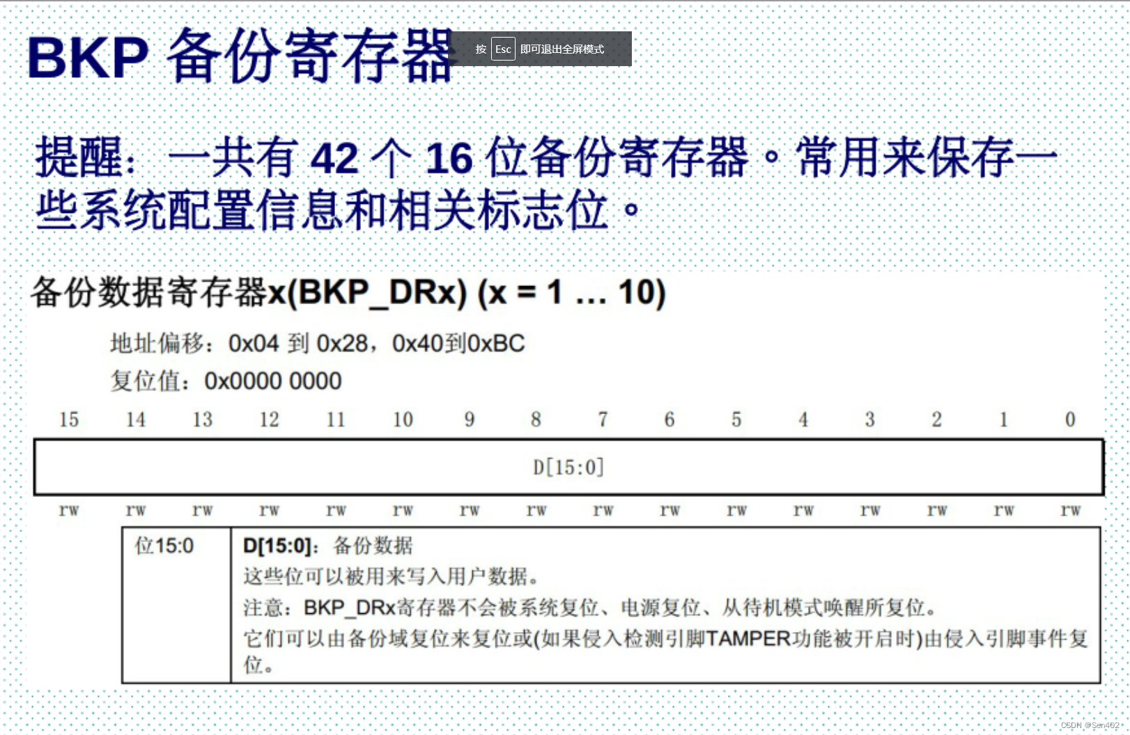 备份寄存器是42个16位的寄存器,可用来存储84个字节数据。它们处在备份区域,当 VDD电源切断,仍然由 VeAt维持供电。当系统在待机模式下被唤醒,或者系统复位或者电源复位,它们也不会复位。