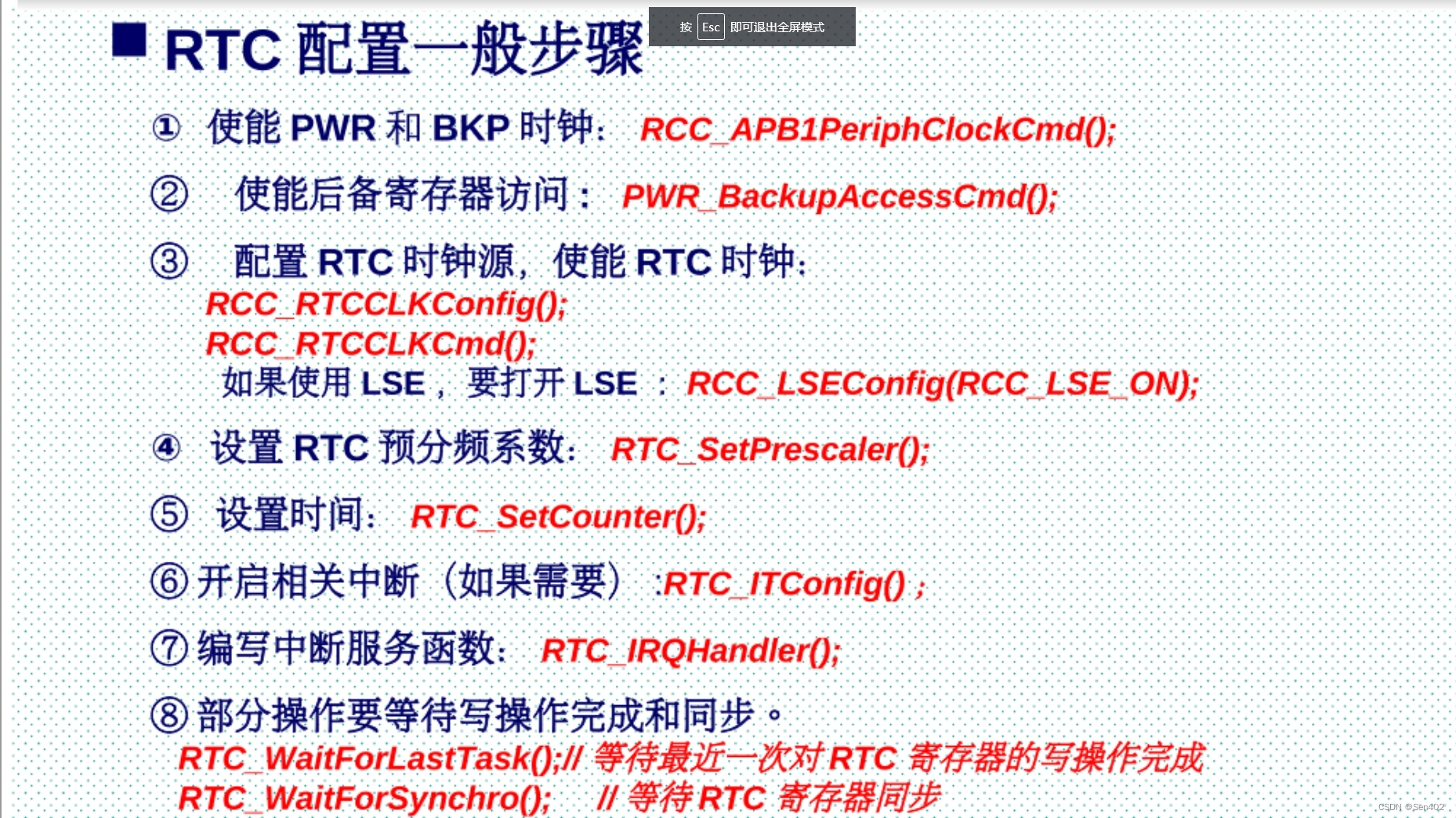 设置寄存器RCC APB1ENR的 PWREN 和 BKPEN 位,使能电源和后备时钟、设置寄存器 PWR CR.的 DBP位,使能对RTC和后备寄存器的访问。