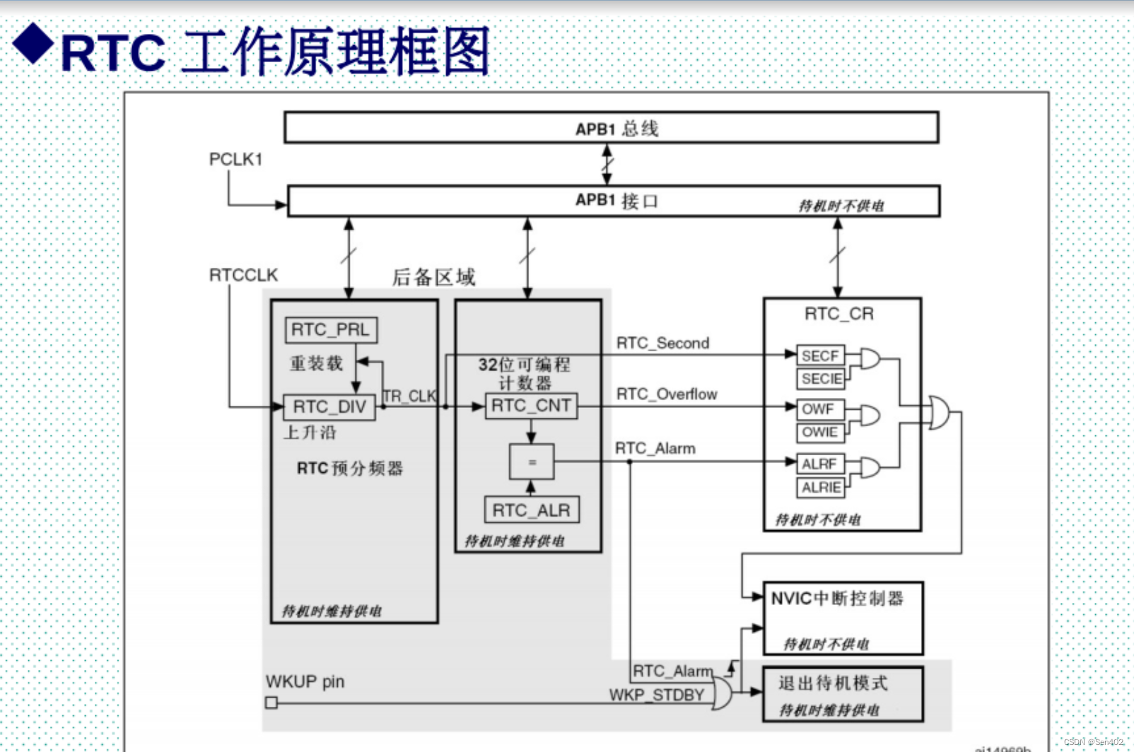 APB1接口:用来和 APB1总线相连·通过 APB1接口可以访问RTC的相关寄存器(预分频值,计数器值,闹钟值)。