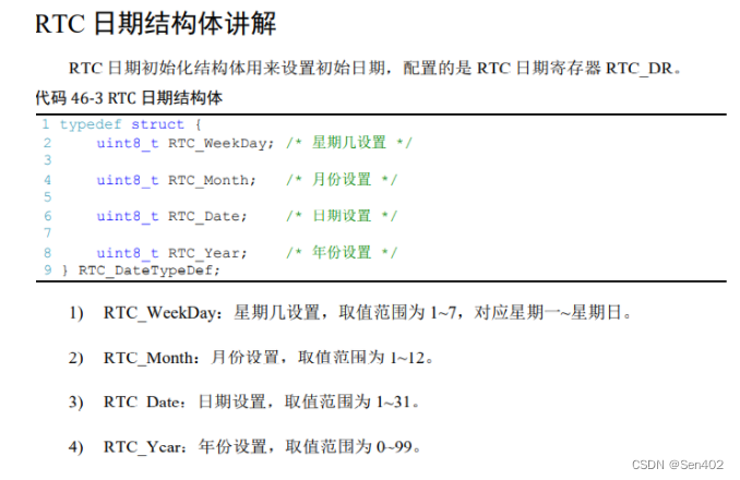 };使用此结构体,您可以读取和设置RTC时间。例如,设置RTC时间的函数可能如下所示: