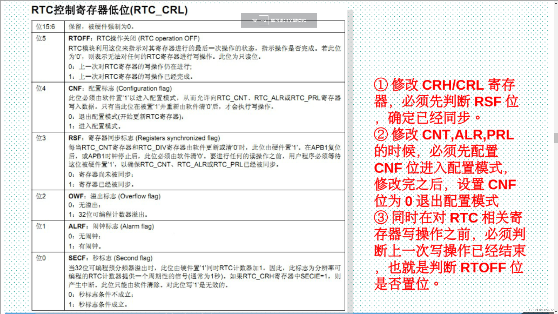 RTC内核完全独立于 APB1接口,软件通过 APB1接口对 RTC相关寄存器访问·但是相关寄存器只在 RTC APB1时钟进行重新同步的RTC时钟的上升沿被更新·所以软件必须先等待寄存器同步标志位(RTC CRL的 RSF位)被硬件置1才读。