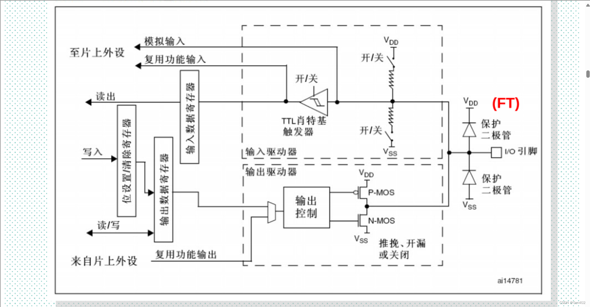 (2)P-MOS管和N-MOS管:由P-MOS管和N-MOS管组成的单元电路使得GPIO具有“推挽输出”和“开漏输出”的模式 。 这里的电路会在下面很详细地分析到。