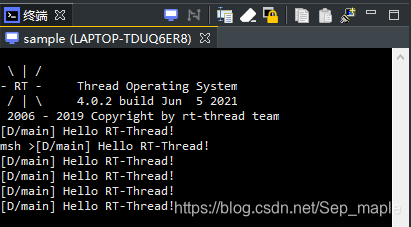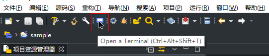 3.3 点击如图1.3.4所示的按钮,打开RT-Thread Studio自带的串口工具连接开发板,然后关机重启主板,会看到如图1.3.5所示的打印信息,至此第一个历程创建并运行成功,接下来进行RT-Thread启动流程详解。注意:RT-Therad Studio自带的串口工具实为Putty,和正点原子的一键下载电路有冲突,不能按键重启和软复位,建议使用sscom等串口工具。