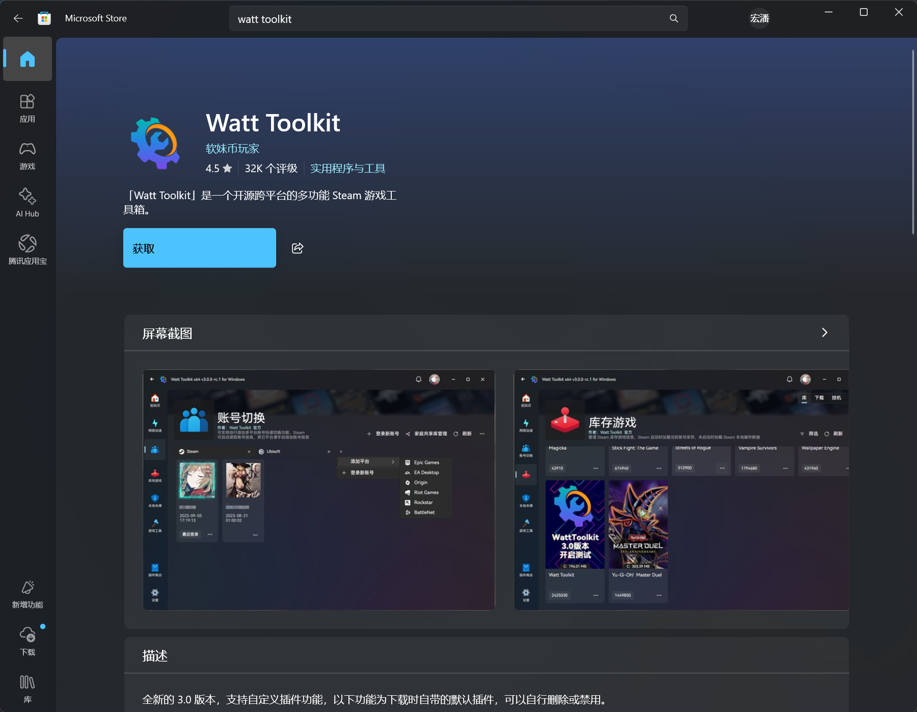 1.在微软商店下载瓦特工具箱(watt toolkit)