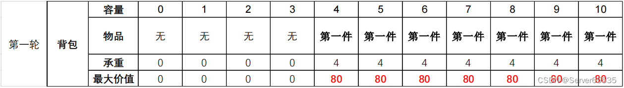 再考虑背包容量为 9,8,7,6,5,4 的,若装入,则价值为 bag[9-w[1]] + v[1] = bag[5]+v[1]= 0 + 80,也都比原来的 bag[i] = 0 获得更大的价值,所以更好。