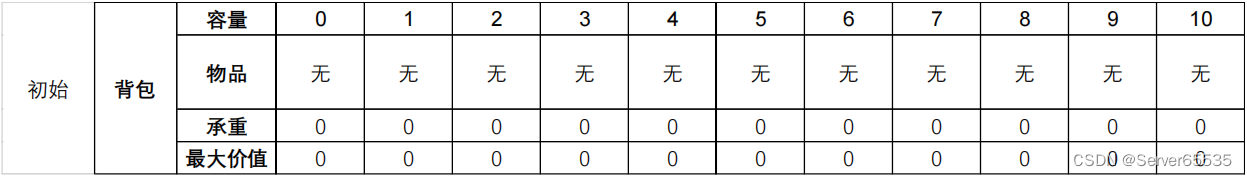 下面就上面的样例数据来看看这些背包的价值变量情况,以 bag[i]表示背包容量为 i 的当前最大价值: