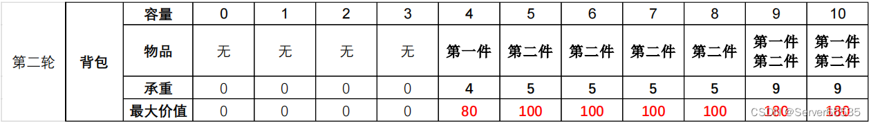 依然先考虑背包容量为 10 的,由于当前物品为 w[2] = 5,容量要不超过 10,则空余容量只能选择原来容量 bag[10-w[2]]~bag[0]的背包,若这样装入背包 10 中,则价值为bag[10-w[2]] + v[2] = bag[5] + 100 = 80 + 100 = 180,而原来 bag[10]的价值为 80,显然这种装入会比原来获得更大的价值,所以 bag[10]的值更改为 180。