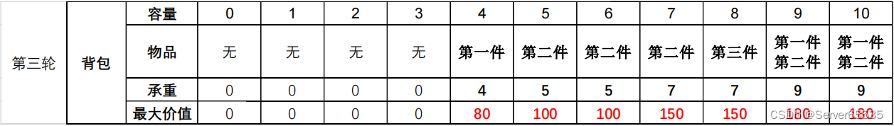 依然先考虑背包容量为 10 的,由于当前物品为 w[3] = 7,容量要不超过 10,则空余容量只能选择原来容量 bag[10-w[3]]~bag[0]的背包,若这样装入背包 10 中,则价值为bag[10–w[3]] + v[3] = bag[3] + 150 = 0 + 150 = 150,而原来 bag[10]的价值为 180,显然这种装入不比原来获得更大的价值,所以 bag[10]的值不变。(背包容量为 9 也同样处理)