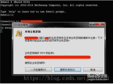 8、如果是第一次连接,会弹出一个警告框,如果只是临时用的会话连接,则选择”一次性接受“按钮;如果是以后要一直使用,则选择”接受并保存“按钮