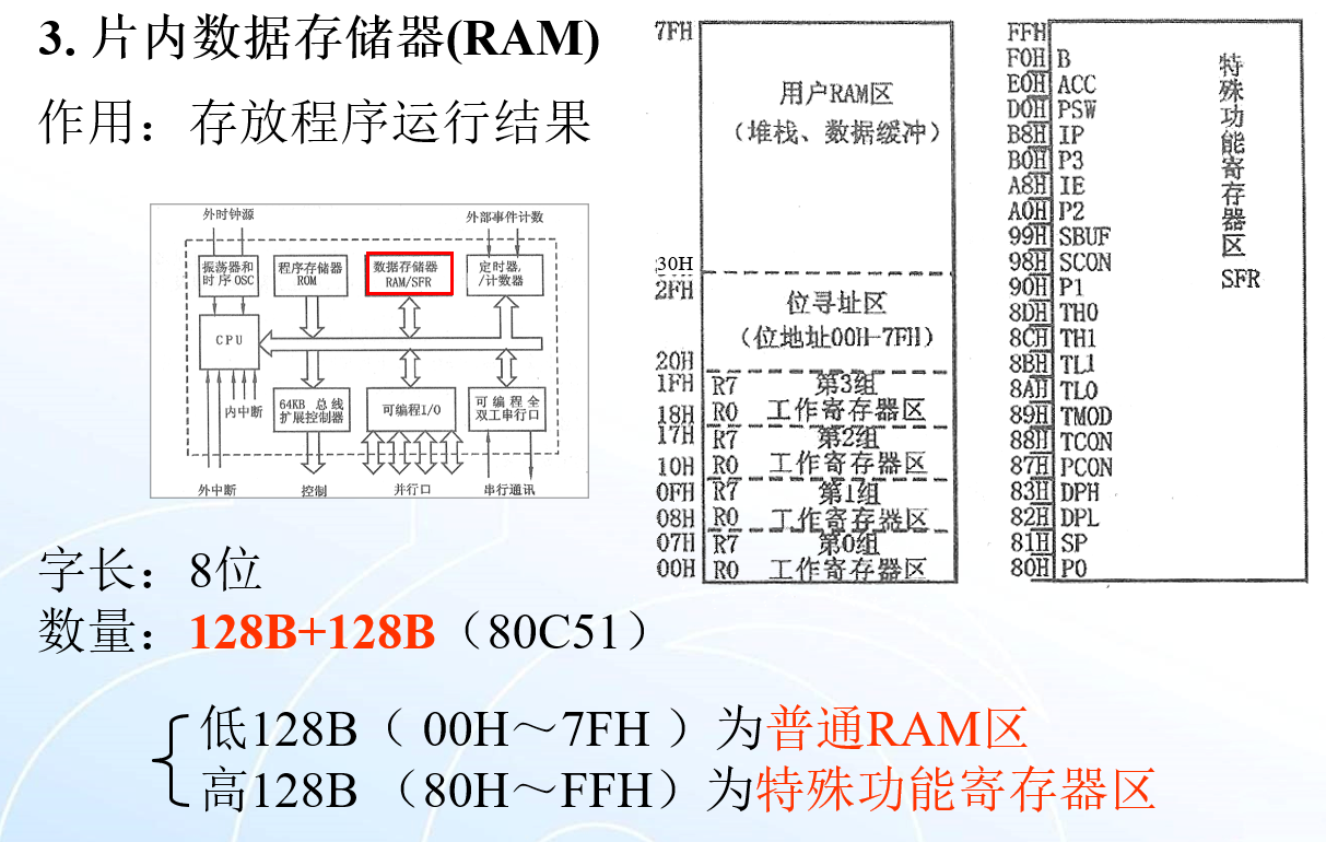 RAM:相当于电脑的内存,用于临时存储数据,掉电丢失。
