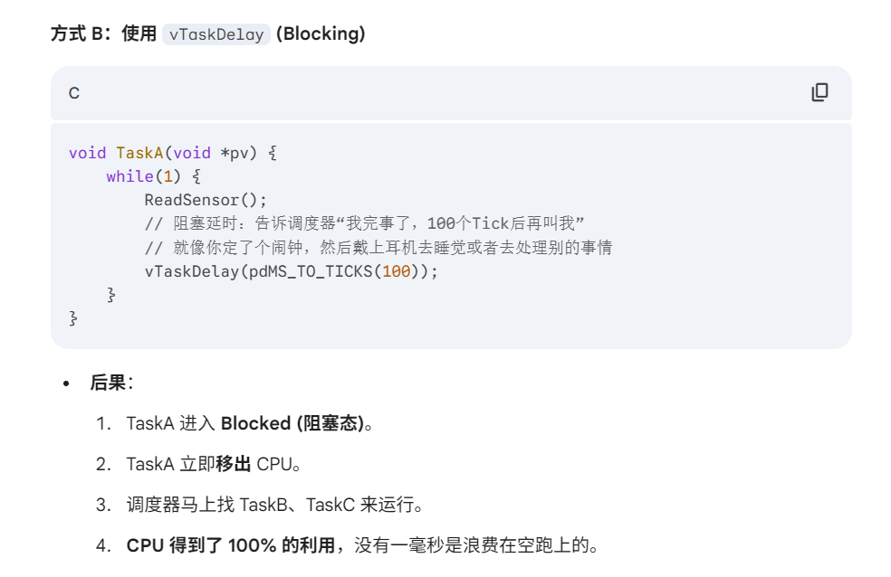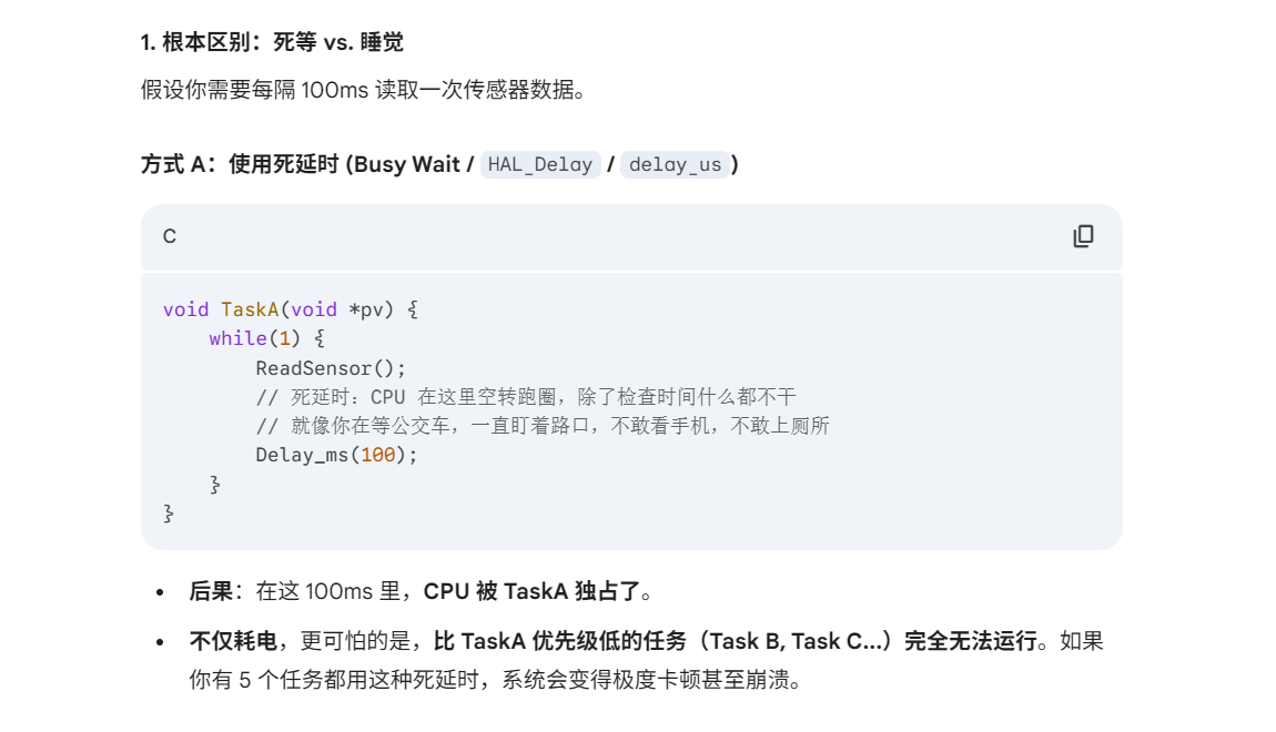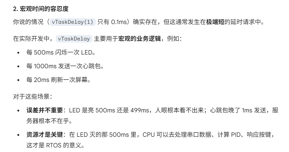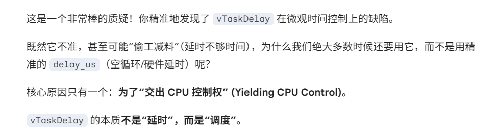 我们用 vTaskDelay 不是因为它准,而是因为它懂事(懂得让出 CPU)。