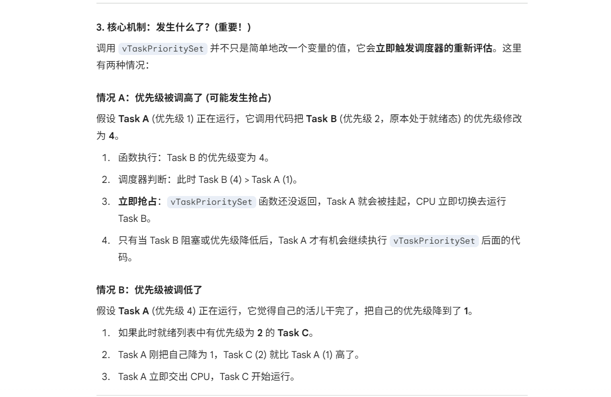 抢占:假设优先级 1 的任务正在运行,此时优先级 3 的任务(比如等待的定时器到了)突然变成了就绪态。调度器会立即暂停优先级 1 的任务,切换到优先级 3 的任务。