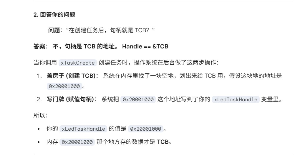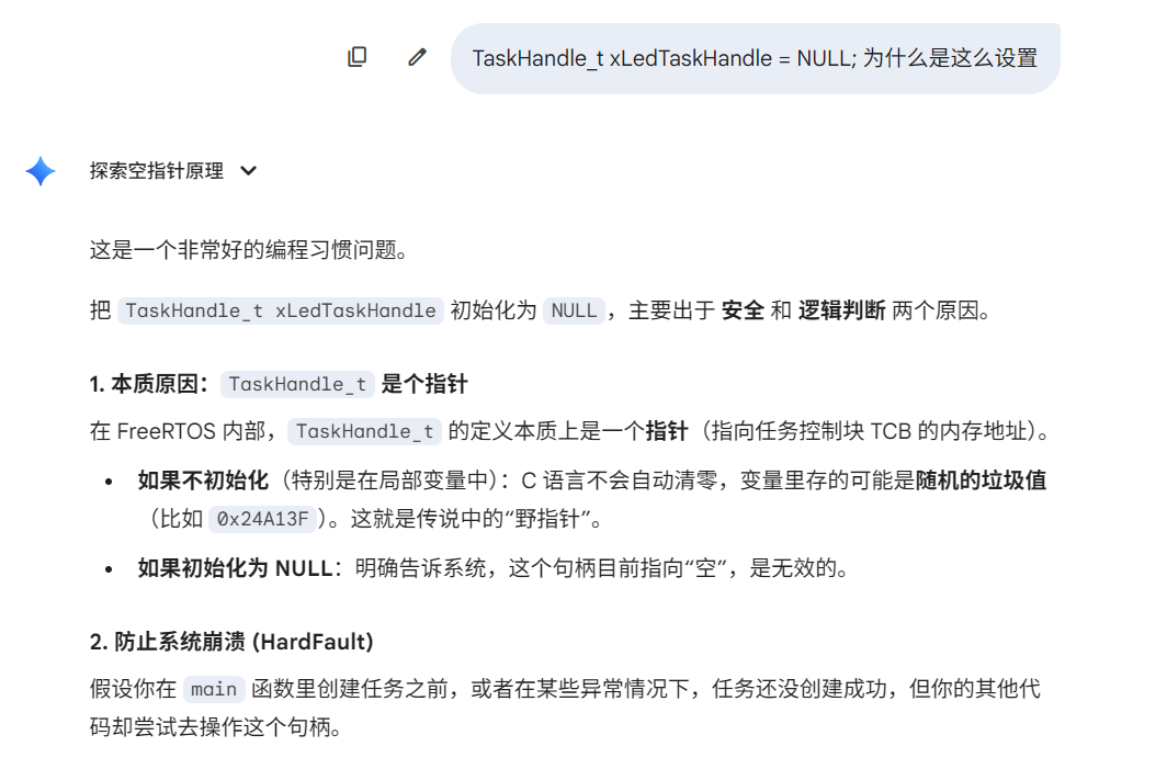写成 TaskHandle_t xLedTaskHandle = NULL; 的作用就像是: 给员工发一张空白的工牌,而不是随便捡一张废纸写个假号码。