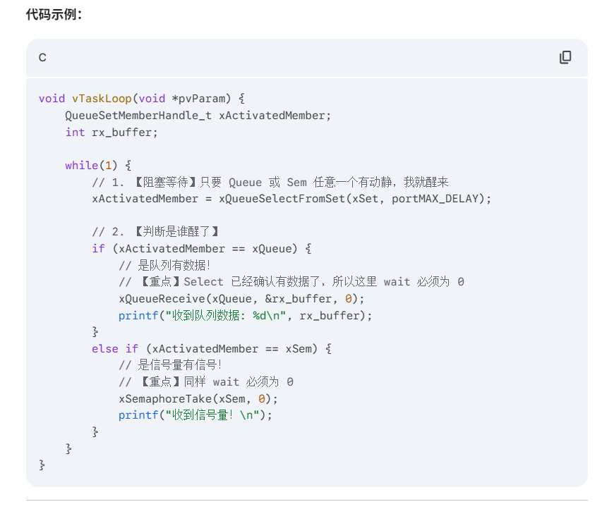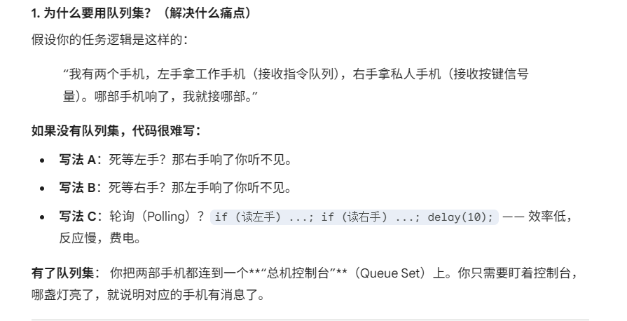 它的核心作用只有一句话:让一个任务能够同时“死等”多个队列(或信号量)。