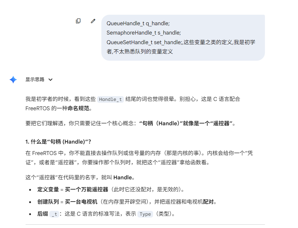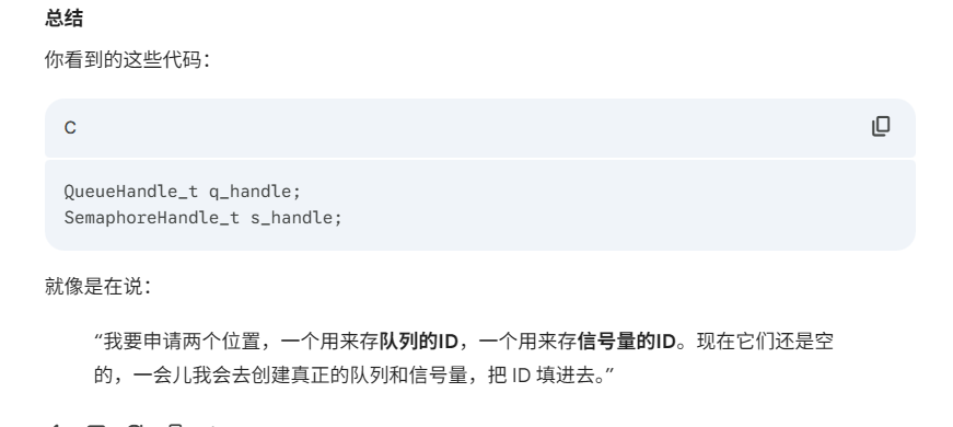 SemaphoreHandle_t 就是 FreeRTOS 中用来代表一个信号量(Semaphore)或互斥量(Mutex)的“身份证”或“遥控器”。