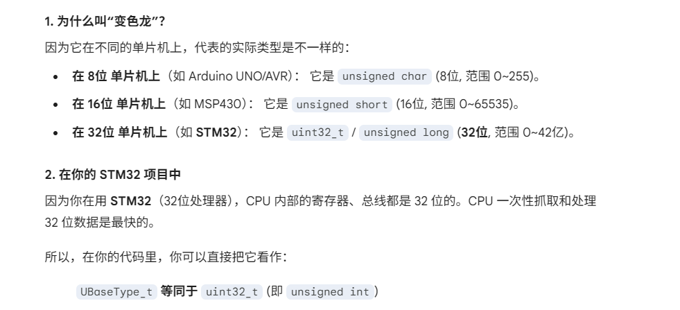 简单来说,UBaseType_t 是 FreeRTOS 定义的一个**“变色龙”数据类型**。