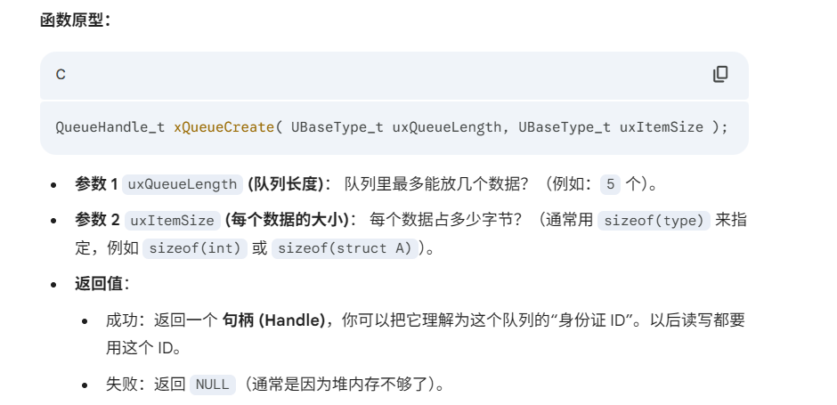 QueueHandle_t xQueueCreate( UBaseType_t uxQueueLength, UBaseType_t uxItemSize );
