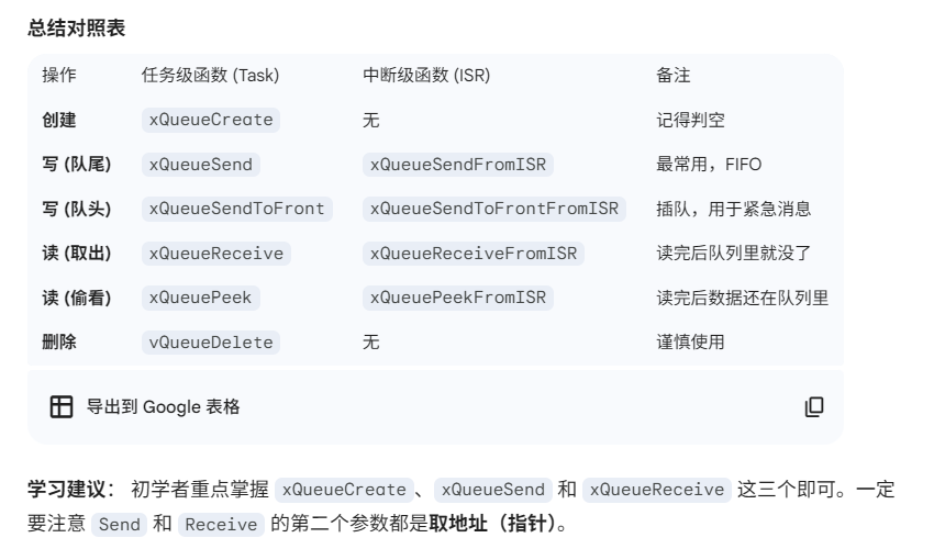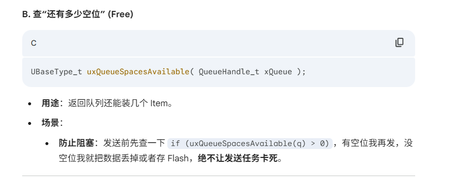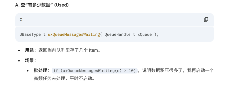 有时候我们不想阻塞(不想睡觉),只想“看一眼”队列的情况再做决定。FreeRTOS 提供了两套查询函数: