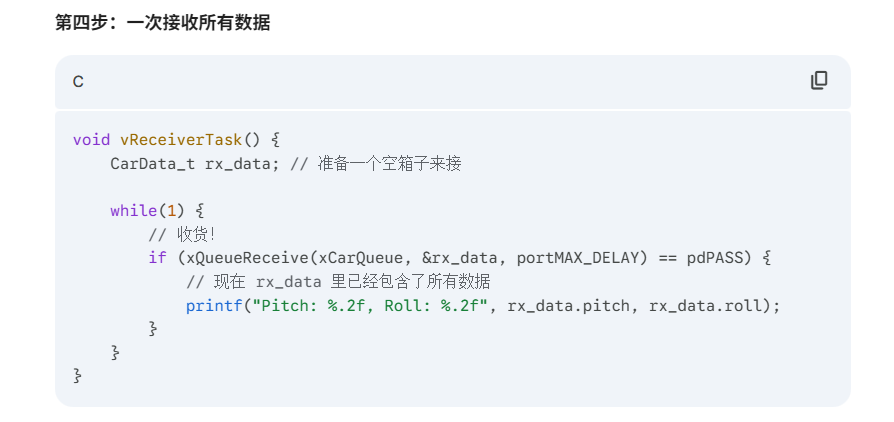 if (xQueueReceive(xMyQueue, &rev_data, portMAX_DELAY) == pdPASS) {