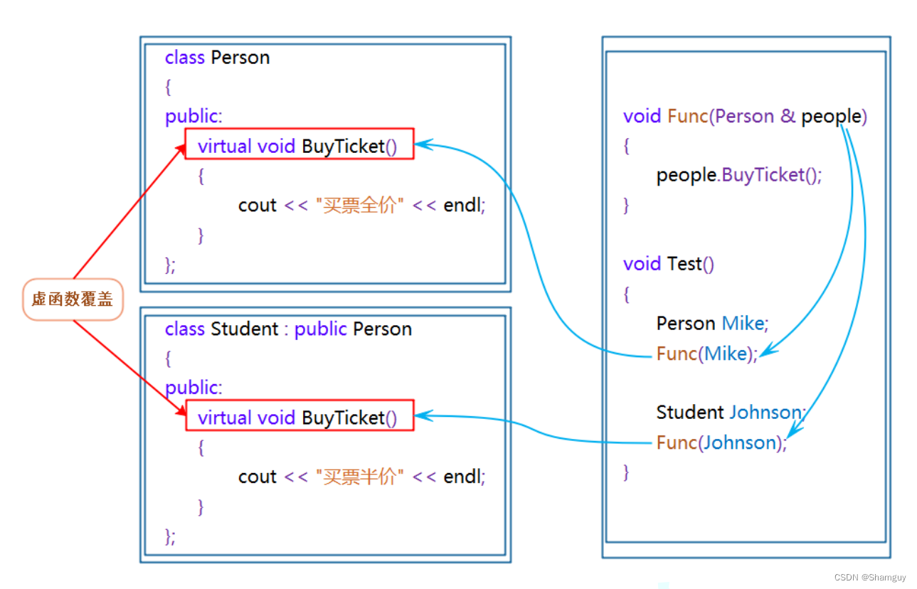 virtual void BuyTicket() { cout << "买票-全价" << endl; }