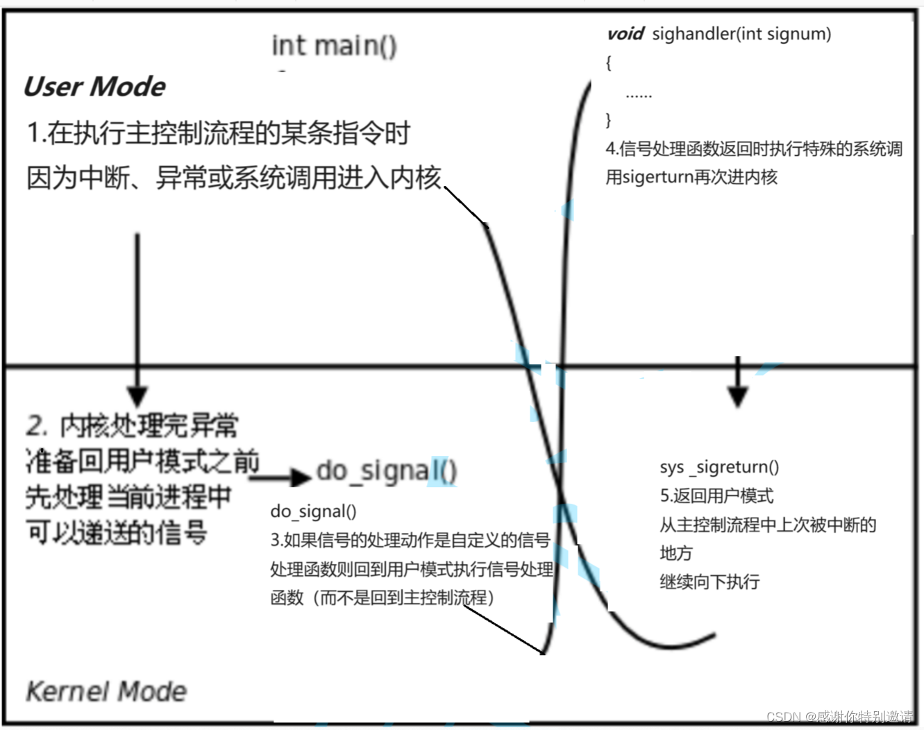 - 类似中断的处理程序,对于需要处理的信号,进程可以指定处理函数,由该函数来进行处理,也就是自定义捕捉信号。