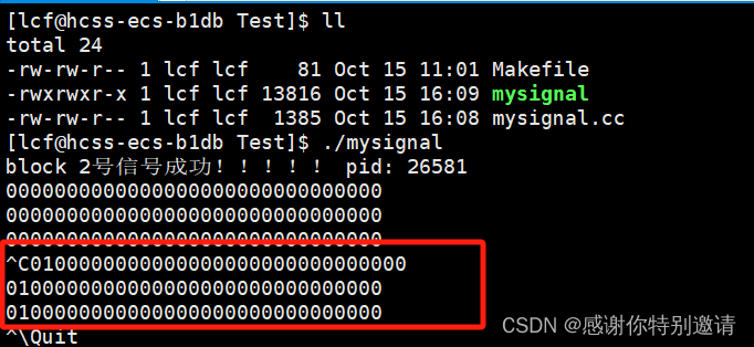 - .如果我们将2号信号进行block,并且不断打印当前进程的pending信号集,然后突然给该进程发送2号信号,那应该可以肉眼观察到有一个比特位有0置1.