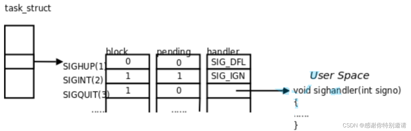 从上图来看,每个信号只有一个bit的未决标志,非0即1,不记录该信号产生了多少次,阻塞标志也是这样表示的。因此,未决和阻塞标志可以用相同的数据类型sigset_t来存储,sigset_t称为信号集,这个类型可以表示每个信号的"有效"或"无效"状态,在阻塞信号集中“有效"和“无效”的含义是该信号是否被阻塞,而在未决信号集中"有效"和“无效"的含义是该信号是否处于未决状态。
