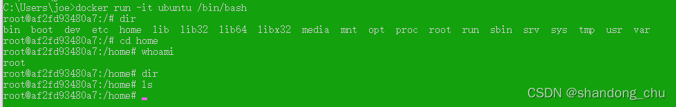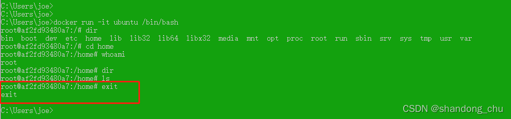 C:\Users\joe>docker run -it ubuntu /bin/bash