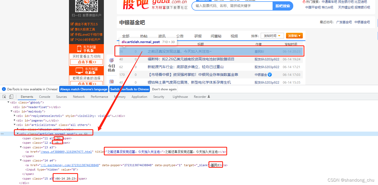 打开浏览器的开发者模式工具,然后定位到需要爬的数据行,如下图: