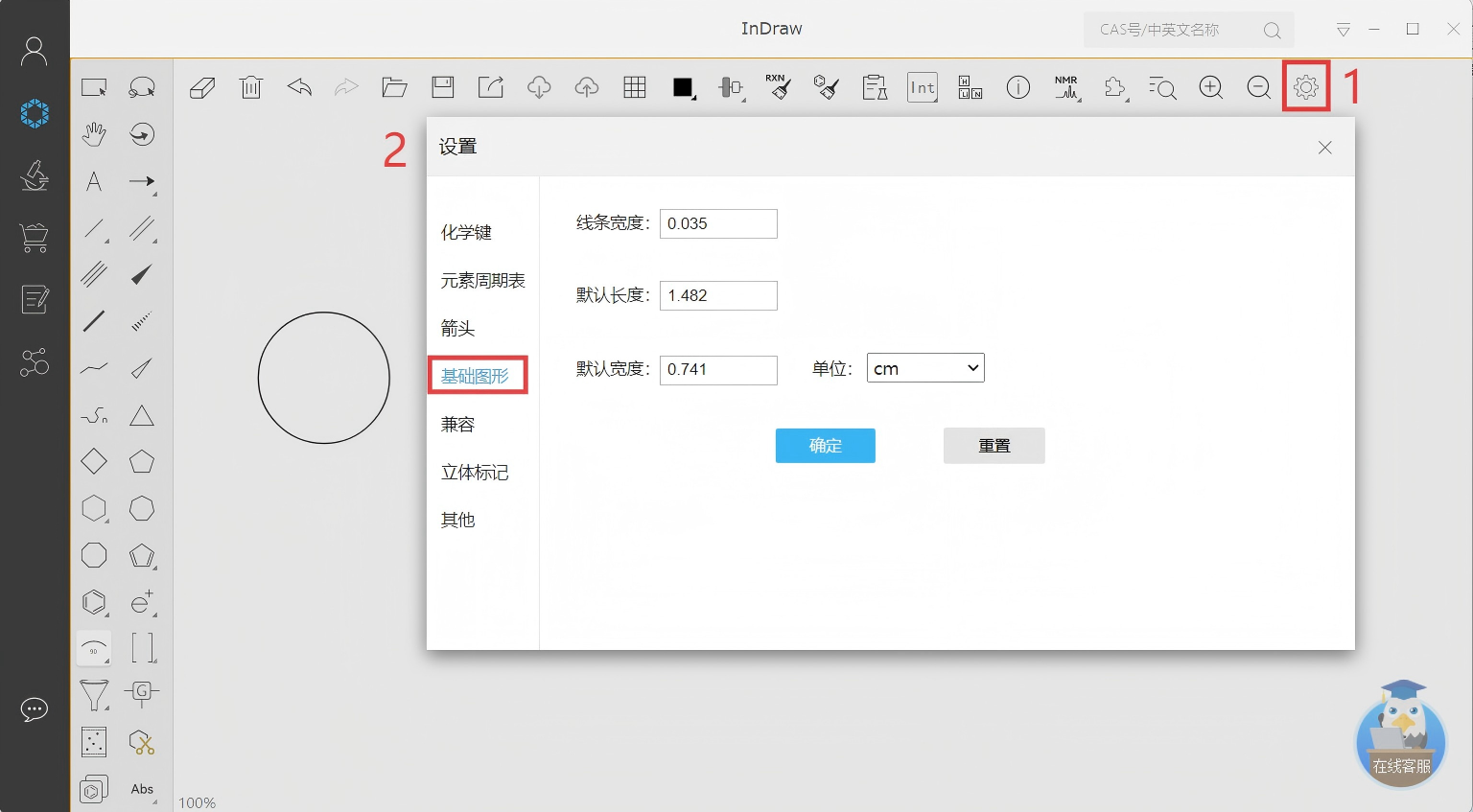 在顶部工具栏中,设置→基础图形,可以对基础图形的各项参数进行设置,包括线条宽度、默认长度、默认宽度、单位等。