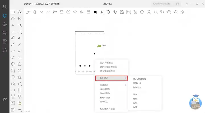 点击左侧工具栏中的TLC按钮,在画布中按住左键拖动,可绘制 TLC 板。拖动过程中即控制斑点个数,松开左键即确定当前斑点个数,之后可对TLC板的尺寸进行调整。