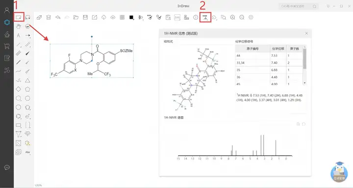 2. 点击顶部工具栏中的“核磁图谱预测”,在弹窗中选择需要预测的分析图谱类型(如 1H NMR, 13C NMR, H-H COSY, HSQC),即可查看对应的谱图及化学位移(支持一键将化学位移复制粘贴到 Word/Excel/PPT)。