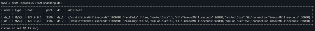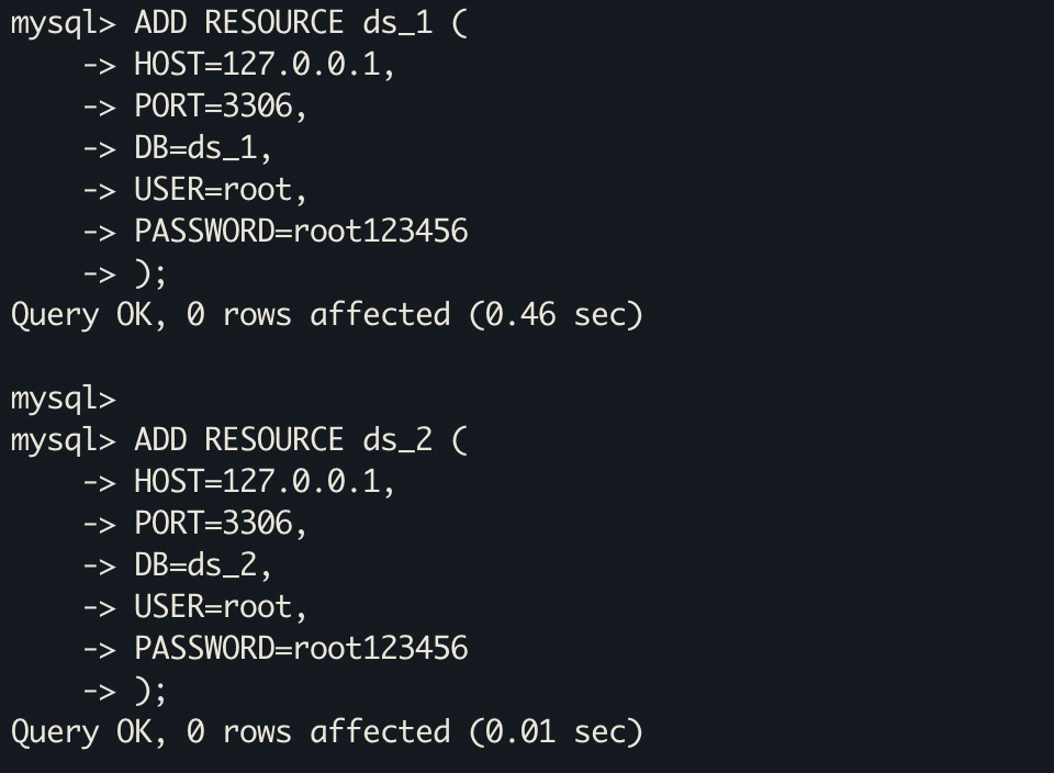 执行 RDL 配置 2 个用于分片的数据源资源 ds_1 和 ds_2