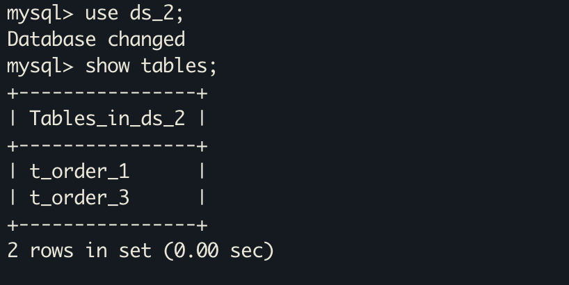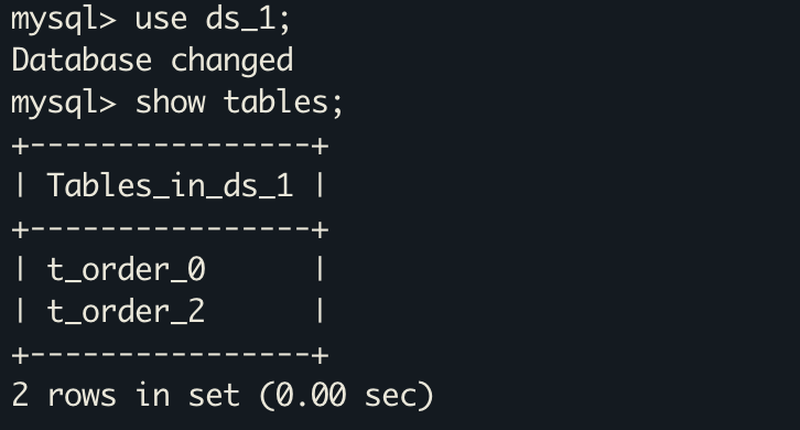 在 ShardingSphere-Proxy 端成功创建分片表 t_order 后,通过客户端连接到底层数据库 ds_1 和 ds_2,ShardingSphere 已经根据 t_order 表的分片规则自动创建了分片表