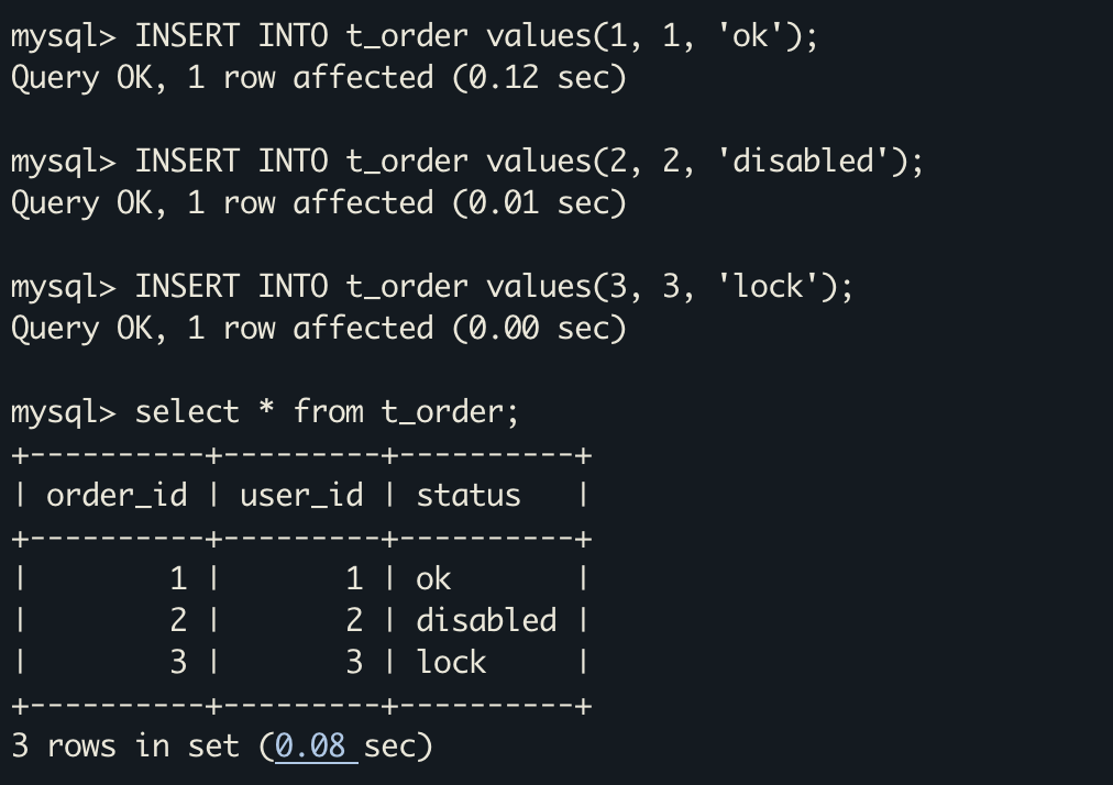 分片表创建完成后,继续在 ShardingSphere-Proxy 端执行 SQL 语句插入数据