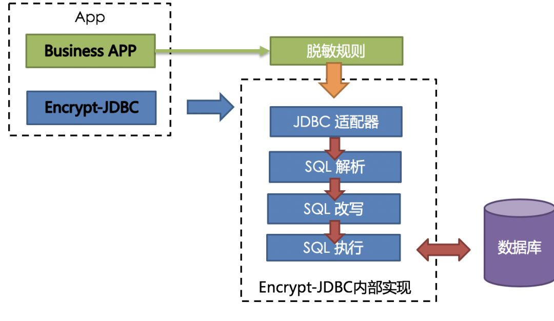 ShardingSphere提供的Encrypt-JDBC和业务代码部署在一起。业务方需面向Encrypt-JDBC进行JDBC编程。由于Encrypt-JDBC实现所有JDBC标准接口,业务代码无需做额外改造即可兼容使用。此时,业务代码所有与数据库的交互行为交由Encrypt-JDBC负责。业务只需提供脱敏规则即可。作为业务代码与底层数据库中间的桥梁,Encrypt-JDBC便可拦截用户行为,并在改造行为后与数据库交互。