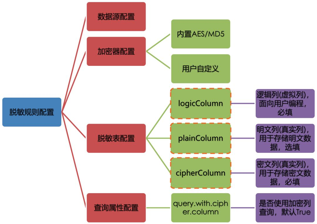 在详解整套流程之前,我们需要先了解下脱敏规则与配置,这是认识整套流程的基础。脱敏配置主要分为四部分:数据源配置,加密器配置,脱敏表配置以及查询属性配置,其详情如下图所示: