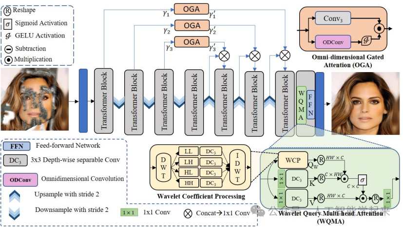 方法:论文提出了一种用于盲图像修复的端到端变换器架构,该架构包含小波查询多头注意力变换器块和全维门控注意力机制。通过小波变换处理图像并将其作为查询传递给多头注意力机制,以减少噪声的影响,并利用全维门控注意力机制将编码器特征有效地传递给解码器,从而实现对图像中损坏区域的有效修复。