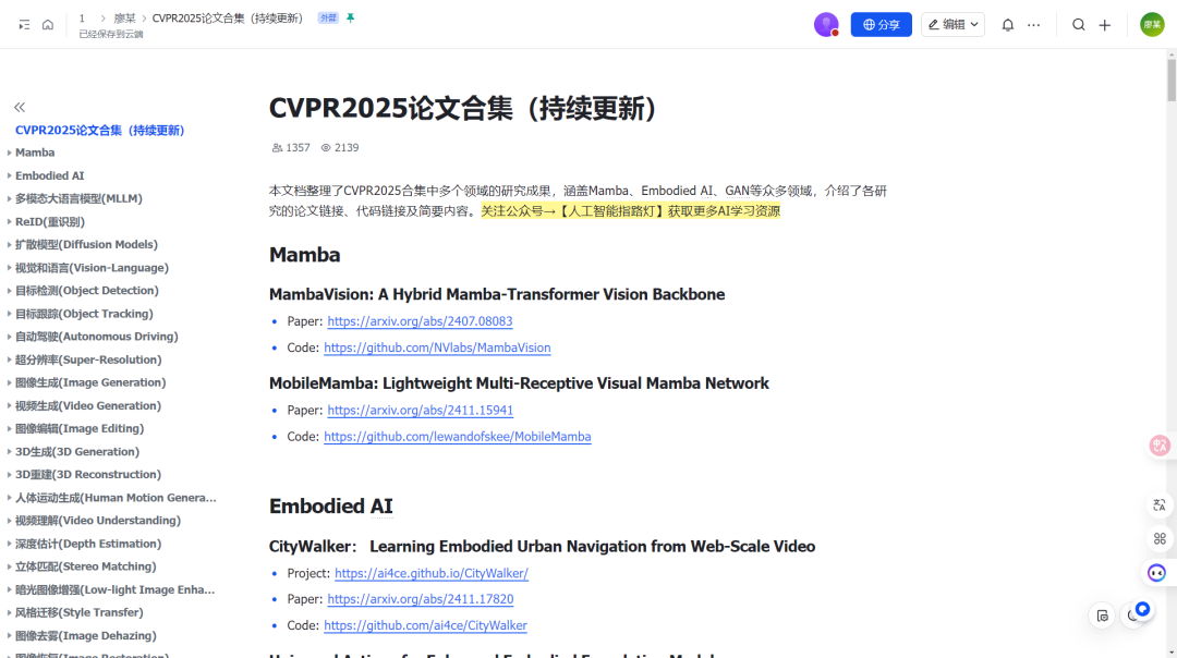 这里给大伙儿分享我整理的CVPR2024、CVPR2025的论文合集,都是目前计算机视觉领域前沿的研究方向,论文与代码的地址我都整理好了,点击链接就能直接跳转到相关页面去。
