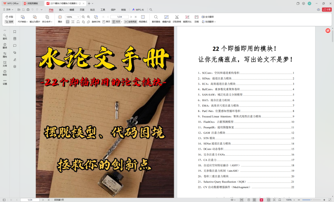 说到涨点,这里给大家分享这包含整整22个即插即用模块的手册,对于只想水篇论文毕业的同学来说,简直轻松又实用,包含注意力机制、卷积变体等等,彻底把你从想创新点、改模型改代码的噩梦中解救出去!所有模块的论文PDF和代码都打包好了,可以分享给大家↓↓↓