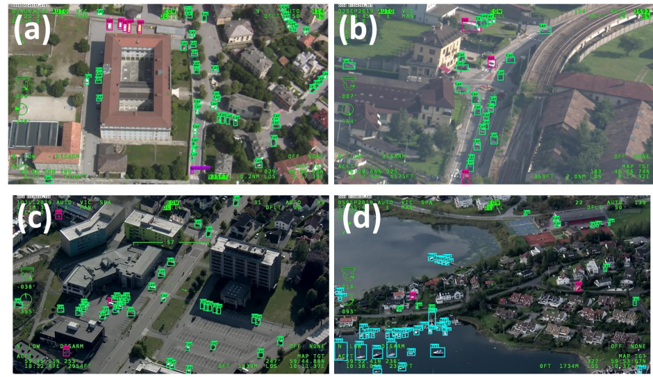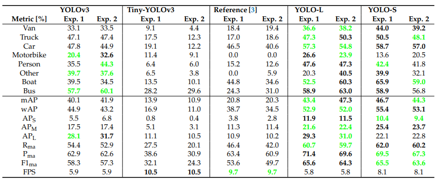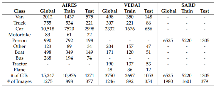 研究者介绍了AIRES(cAr detectIon fRom-hElicopter imagesS),这是一个新的车辆数据库,由1920×1080分辨率的航空全高清(FHD)图像组成,由WESCAM MX-15 EO/IR成像系统传输,该系统放置在多传感器四轴陀螺稳定炮塔系统中,安装在载人警用直升机AW169的前端。直升机在近300米至1000米的不同高度飞行,不同的摄像机角度从约5°至80°不等。这些图像是2019年6月至9月在两个不同的地理区域拍摄的:意大利北部的伦巴第大区和挪威的奥斯陆市。该数据集由1275张用LabelImg软件[36]注释的图像组成,包含15247个注释的地面实况(GT)对象,分为八类:面包车、卡车、汽车、摩托车、人、其他、船和公共汽车。统计数据汇总在表1中:大多数类别是汽车,而人口较少的类别是摩托车,占0.5%,其他类别占0.8%,后者包括推土机和建筑工地使用的其他地面移动车辆。