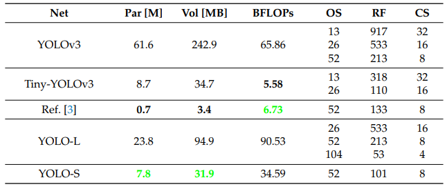 关于所提出的CNN的全部细节见下表,其中还报告了每层的感受野和累积步幅。假设输入图像的大小调整为默认大小416×416。YOLO-L由于推理速度有限,仅适用于高功率硬件上的离线处理,因此主要用于基准测试。YOLO-S,或YOLO-small,是为在边缘设备上部署高效、轻量级和精确的网络而提出的。