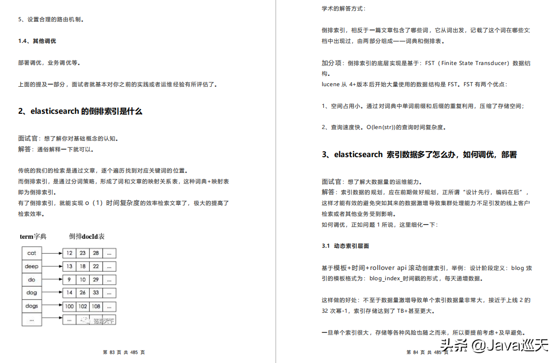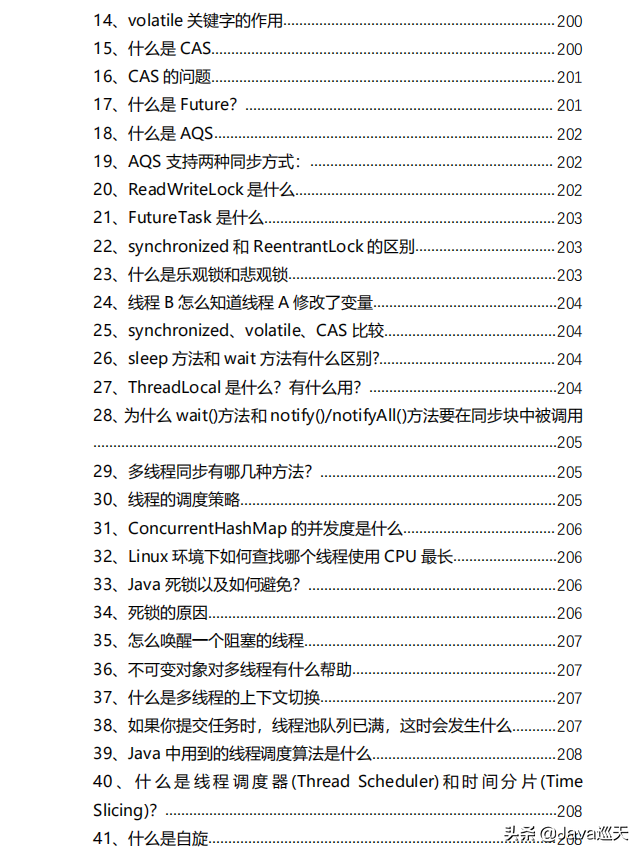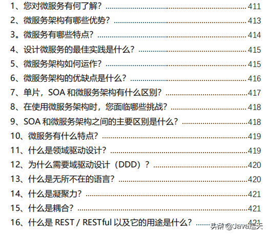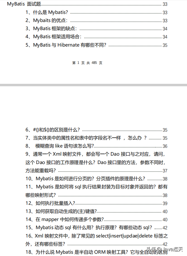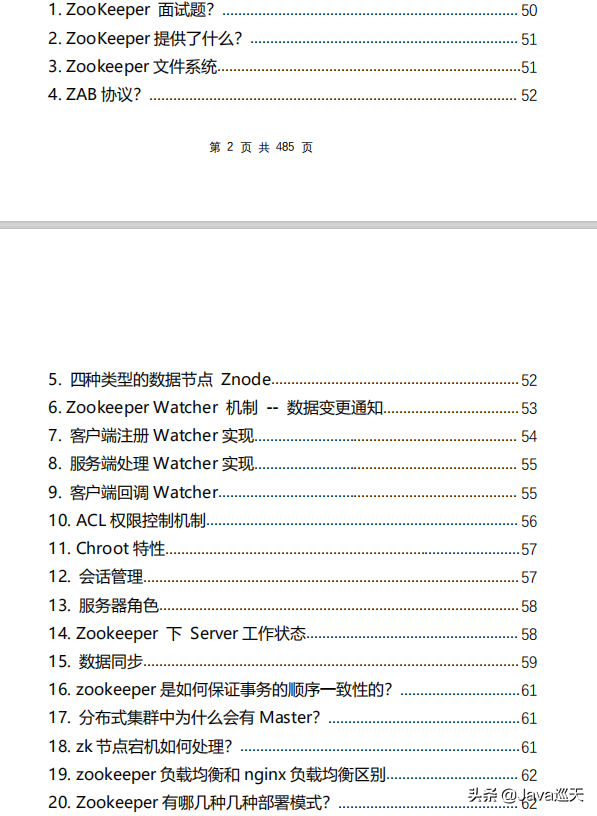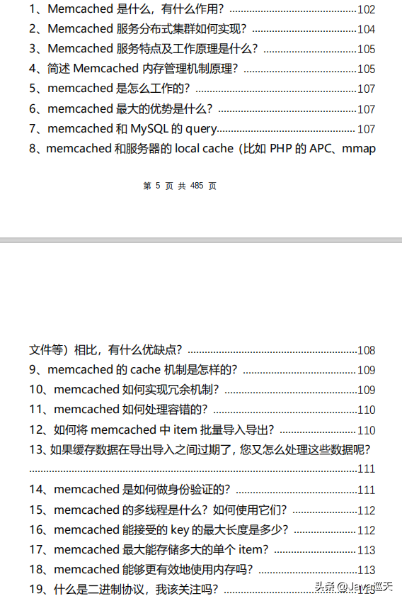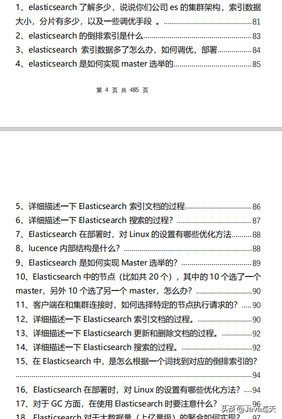 等等,内容涵盖:Java、MyBatis、ZooKeeper、Dubbo、Elasticsearch、Memcached、Redis、MySQL、Spring、Spring Boot、Spring Cloud、RabbitMQ、Kafka、Linux、并发编程等技术栈,一共485页,1000多道题。