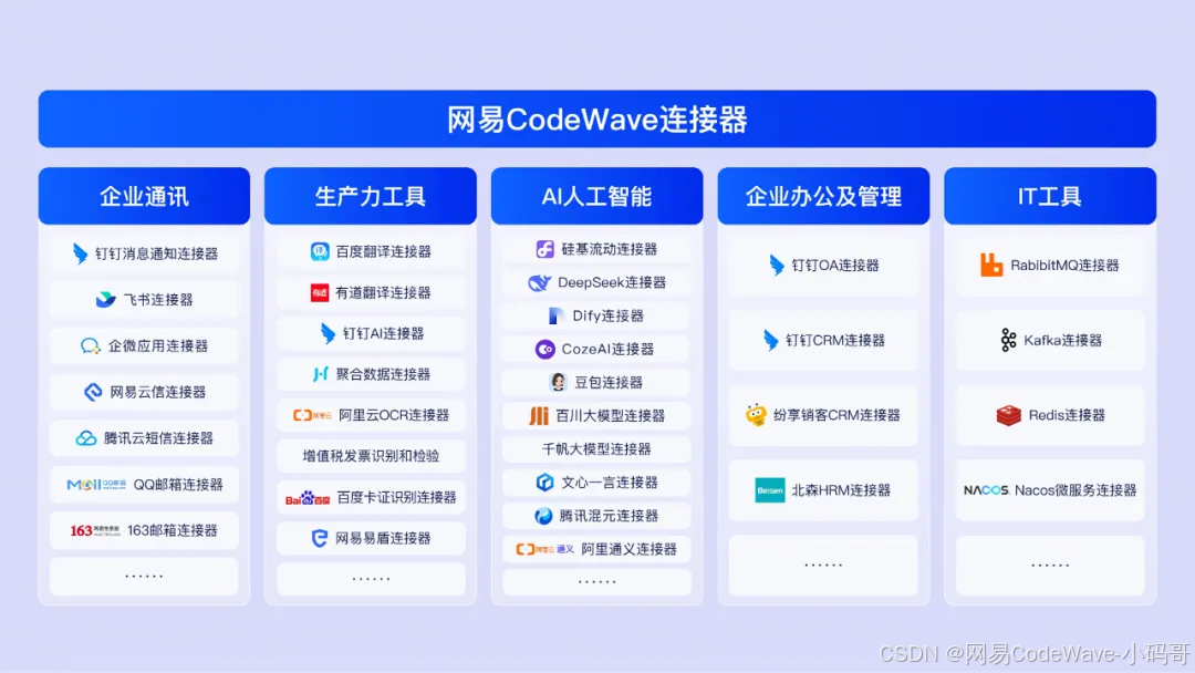 除了AI大模型连接器外,网易CodeWave智能开发平台还覆盖了企业通讯(如即时通讯工具集成)、生产力工具(如协作文档、日程管理)、企业办公及管理(如ERP、CRM系统对接)以及IT开发工具(如代码托管、测试工具)等多个领域。这些连接器的加入,使得平台能够适配企业丰富多样的业务场景。
