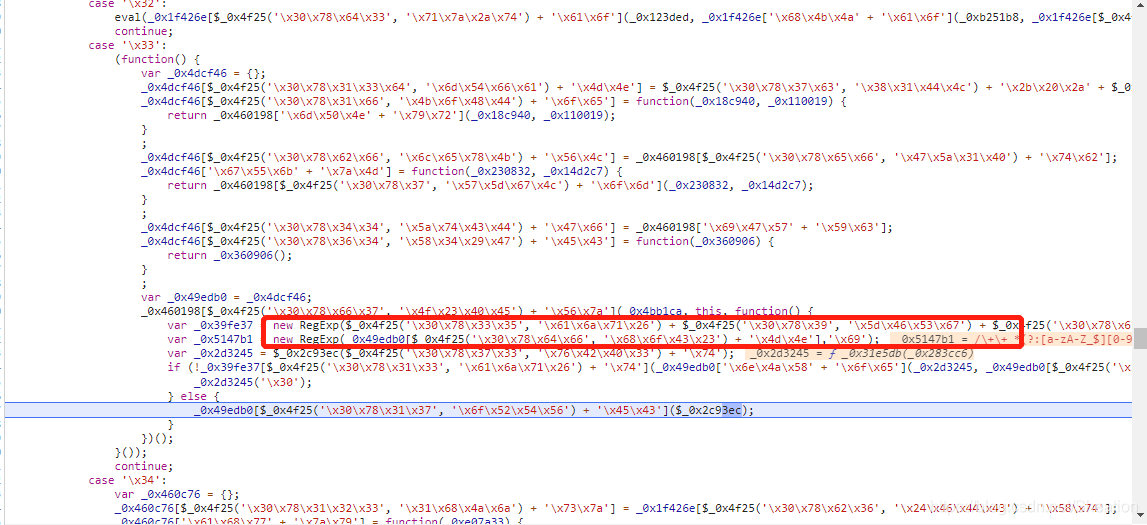 如果不过检测,返回值就是false,所以这个地方还有个粗暴的办法,就是直接把布尔值取反,但是我还是觉得这样不好,其他大道理不知道,但最起码得尊重一下开发者,不过万不得已的情况也只能这样干了。接着走,当断点不再断下来或者直接卡死的话,那就把这些改好的代码解混淆,因为实在看不懂了,然后就会发现: