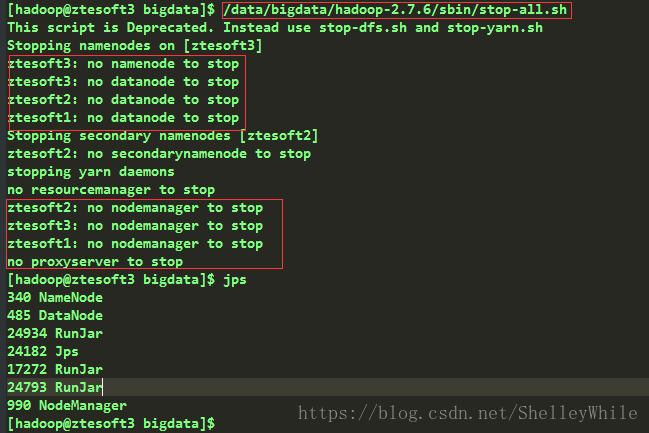 1、由于pid文件已经无法找回,所以只能先用jps获取进程号,然后用kill -9杀掉对应进程,停止集群。