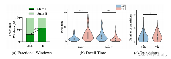 ①“我们提供的时间属性的解释,以了解大脑的灵活性和适应性在精神疾病。具体而言,我们首先应用k-means聚类算法对有窗时空参与的图表示hGT进行聚类,以评估动态大脑模式(状态)。使用基于轮廓分数的聚类有效性分析来确定最佳聚类数量。然后,我们量化这些状态的时间属性的组差异,包括停留时间(即属于一个状态的连续窗口的持续时间),分数窗口(即属于一个状态的总窗口的比例)和转换数量(即状态之间的转换数量)。使用带有错误发现率(FDR)校正的双样本t检验(图4)。我们的分析显示,ASD患者在II状态下有更高的分数窗口和平均停留时间,这与最近的一项神经影像学研究一致”(我失去了paraphrase能力)