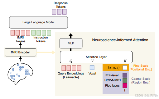 ①在注意力里面,V是某个体素激活,K是那个体素的傅里叶坐标和很多个属于不同脑图谱ROI的区域嵌入: