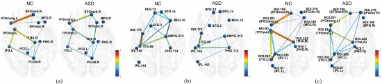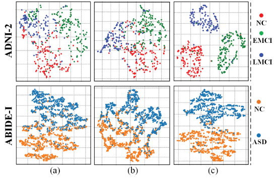 ②t-SNE visualization on (a) AAL only, (b) AAL+BN, (c) AAL+BN+Power: